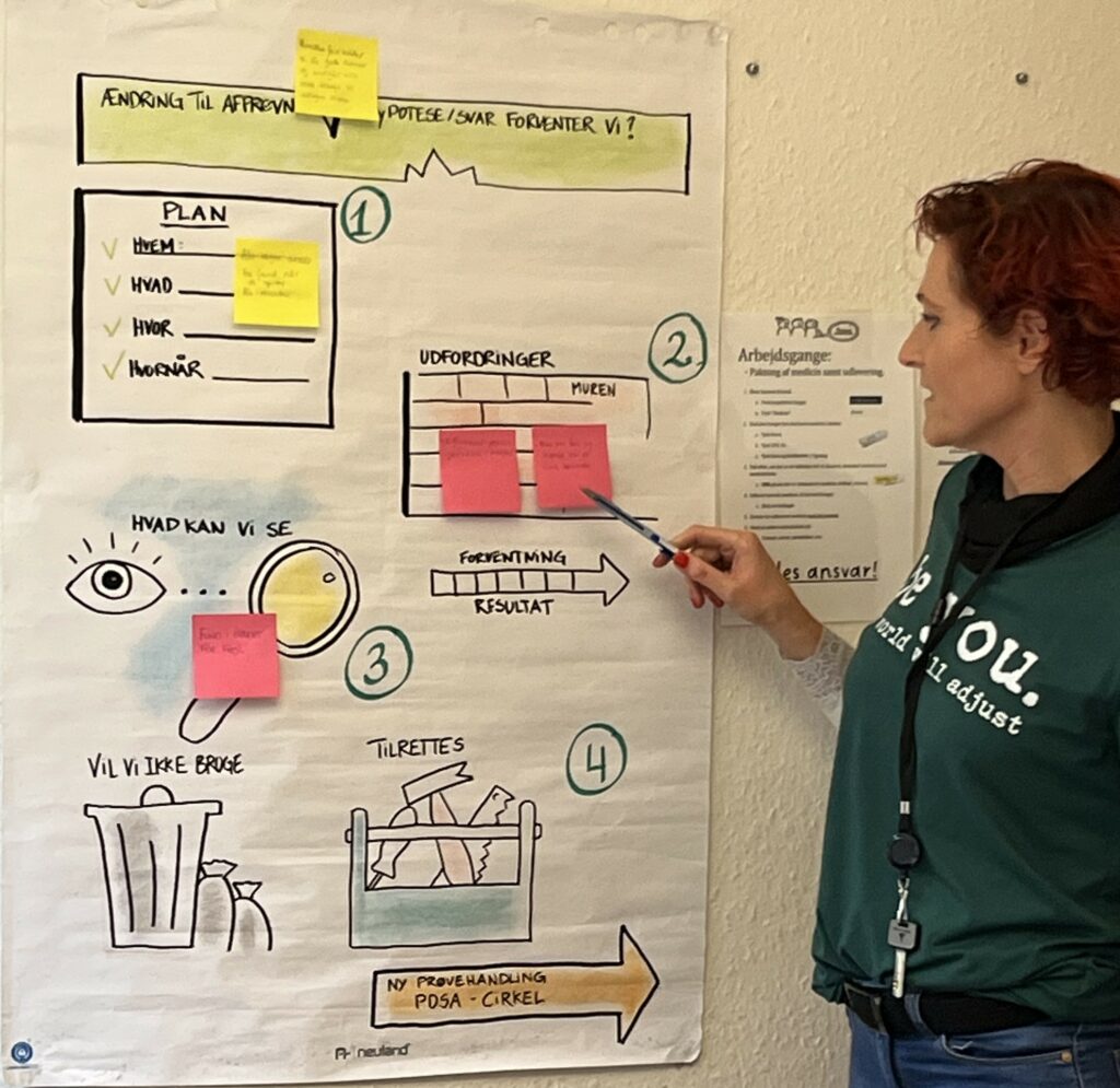 Teamet begynder at tænke i mere visuelle baner på alle områder for at gøre det overskueligt for kollegerne. En af de mest afgørende nyskabelser er, at teamet udvikler deres egen version af PDSA-cirklen, tegnet ud fra deres hverdag, hvor medarbejderne kan følge med i forbedringsarbejdet.